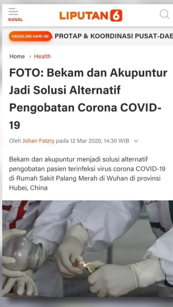 Bekam dan Akupuntur menjadi solusi Alternatif pengobatan pasien terinfeksi virus Corona Covid-19 di rumah Sakit Palang Merah di Wuhan Provinsi Hubei, China ( sumber berita dari kanal Liputan 6 kolom Health, pada 12 maret 2020 oleh Johan Fatzry )